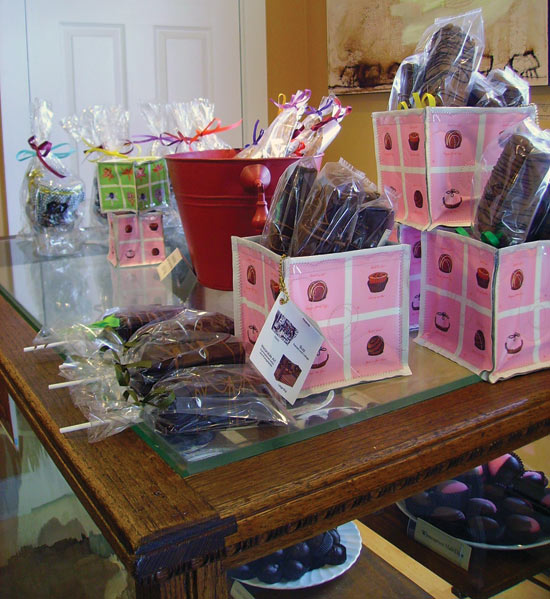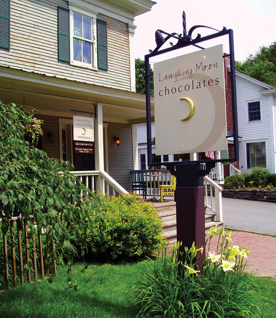 Sweet aromas of caramel, cocoa and vanilla greet visitors to Laughing Moon Chocolates. Glass cases display truffles and candied fruits as if they are showcasing expensive gems. The store’s walls are covered with fine art, elegant pottery, and even honey and herbal remedies by Honey Gardens Apiaries.