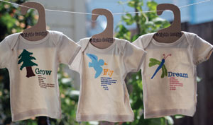 These baby shirts are printed on 100% organic cotton and the original writings are silkscreened by hand with natural, toxin-free inks. Display hangers are made of 100% recycled and recyclable materials.