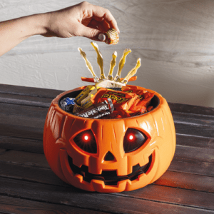 “Our new spooky ceramic treat bowl is really special. It has a motion-activated green ceramic hand that lights up and makes spooky sounds. It is complete with a painted spider web base and ‘boo!’ sentiment,” she said.