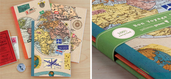 The Bon Voyage Writer’s Notebooks from Galison Green is a line of 100 percent recycled paper products. Using collage elements supplied by Clare Goddard, the notebooks feature images of vintage maps, train and tramway tickets, propeller planes, ships, and old bicycles. Available in a pack of three‚Äîone lined, one graph and one blank; each notebook is 40 pages. Each page measures 6″ x 8″. “The goal when we created this product was comivng up with something that is affordable and useful,” says Juanita Dharmazi, creative director for Galison.