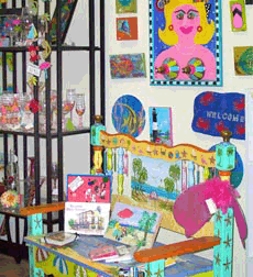 At Eclectibles!, owner Joan Pierce promotes the works of 45 local and 5 regional artists, who create a variety of goods, from furniture and home decor items, to jewelry and stationery. The artists’ works are interspersed throughout the shop for greater visual appeal, rather than displayed in groups according to artist. Intricately hand-painted benches and bookcases are used to showcase glassware, jewelry and stationery, and Christmas trees are used to display not only ornaments but even small hand-painted wall hangings.