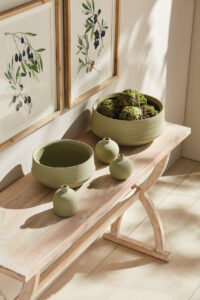 A classic rotund shape and a wide shallow shape makes this terracotta decorative bowl perfect for some natural orbs. The matte soft green glaze of this beauty offers effortless elegance. (B2, 1010)
