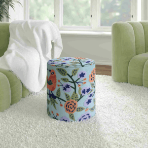 The Blue Bird Ottoman blends modern contemporary and Scandinavian styles, featuring hand-embroidered botanical patterns on a solid base. Carefully handmade, it’s a vibrant yet elegant accent piece, adding artisanal charm to any living space. (B1, 10-E-9)
